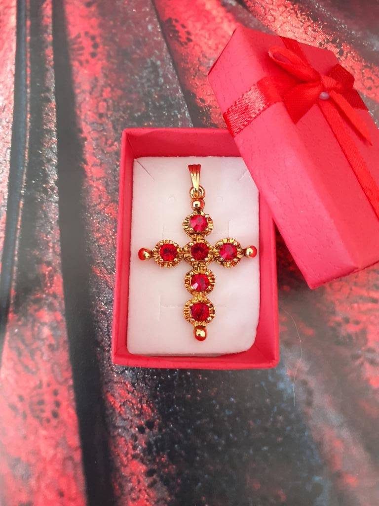 Croix Jeannette cristal grenat bleu